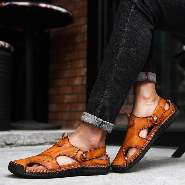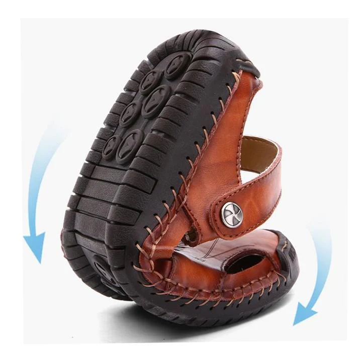 Kaegreel Men's Summer Hand Stitching Soft Outdoor Closed Toe Leather Beach Sandals Slippers
