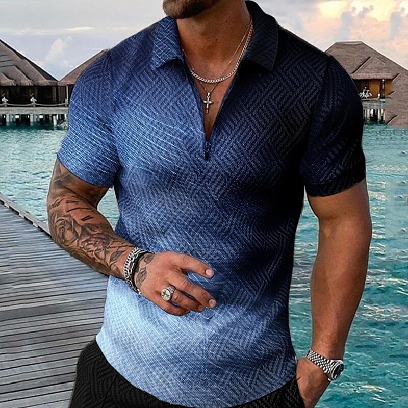 Men's 3D Print Gradient Zipper Short Sleeve Polo T-shirt