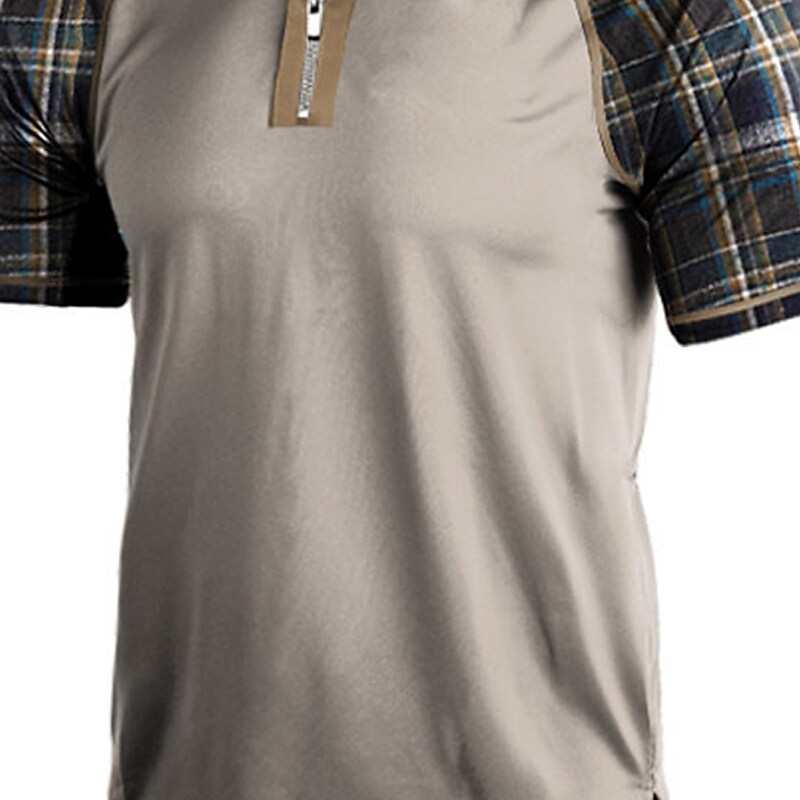 Men's Plaid Color Block Zipper Short Sleeve Polo T-shirt