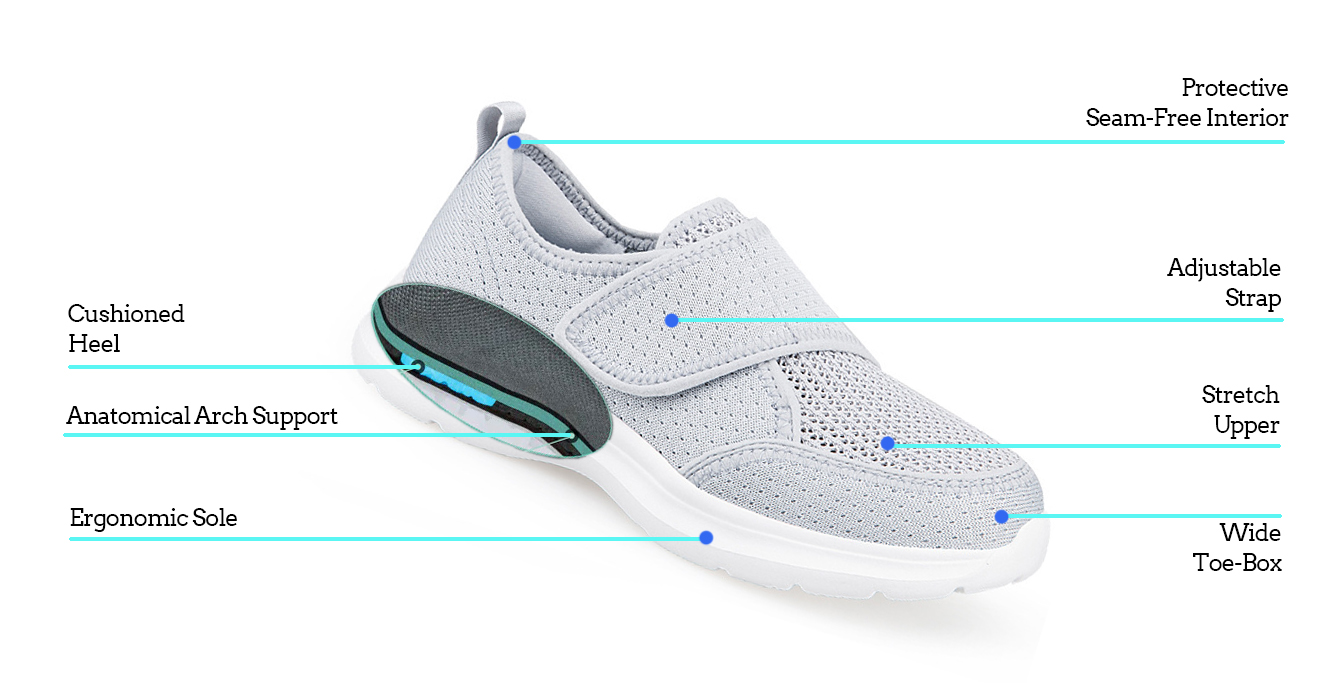• Wide toebox - offers plenty of space for bunions, hammertoes, & swollen feet.