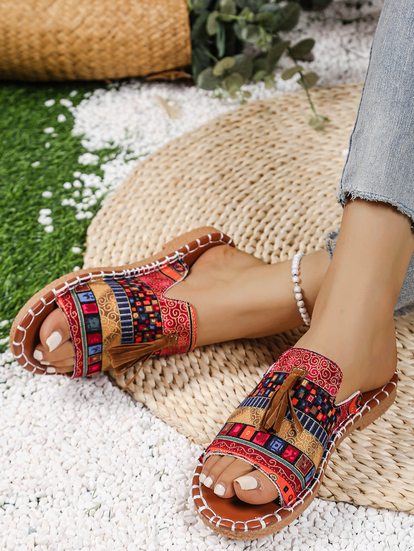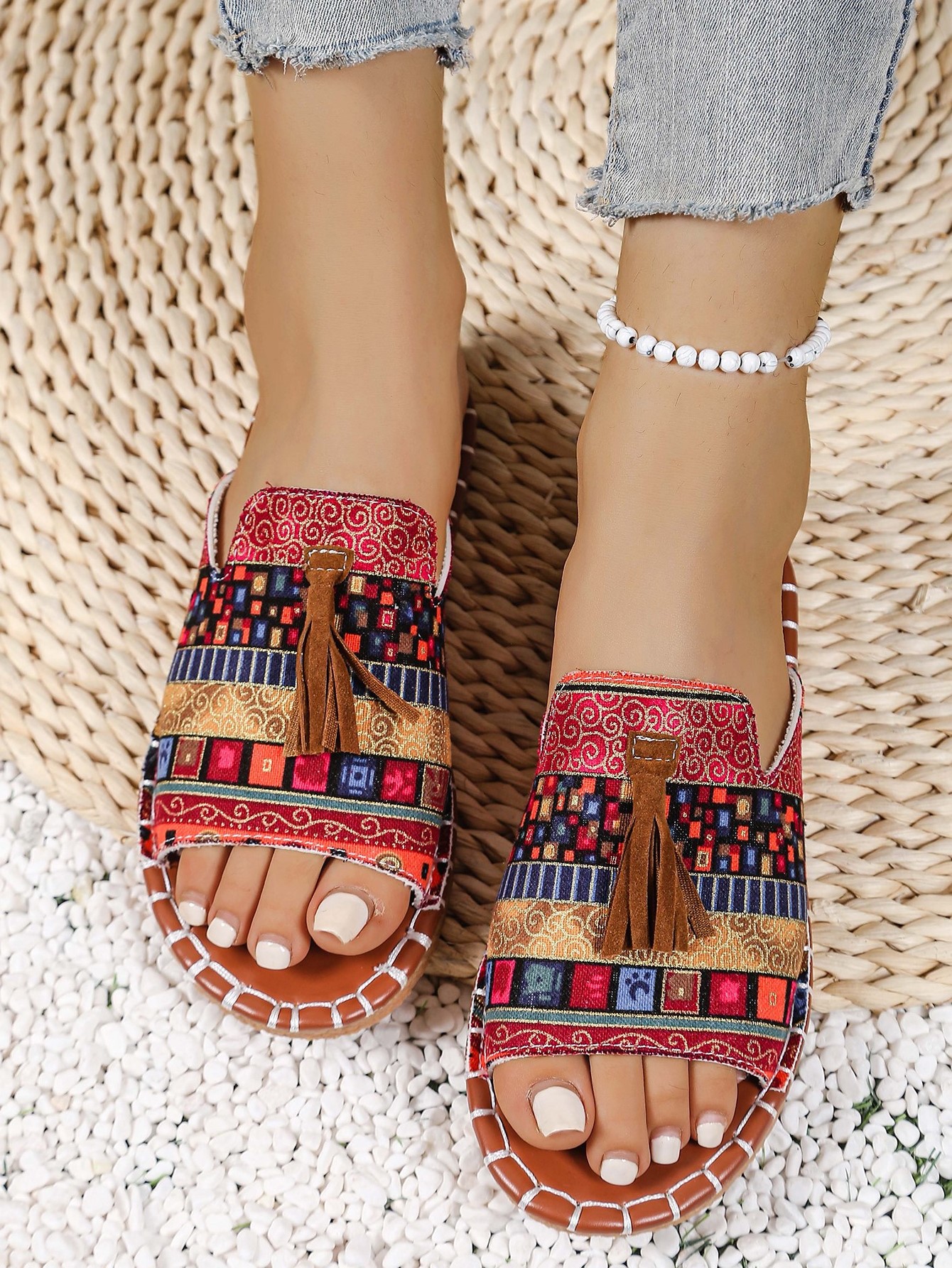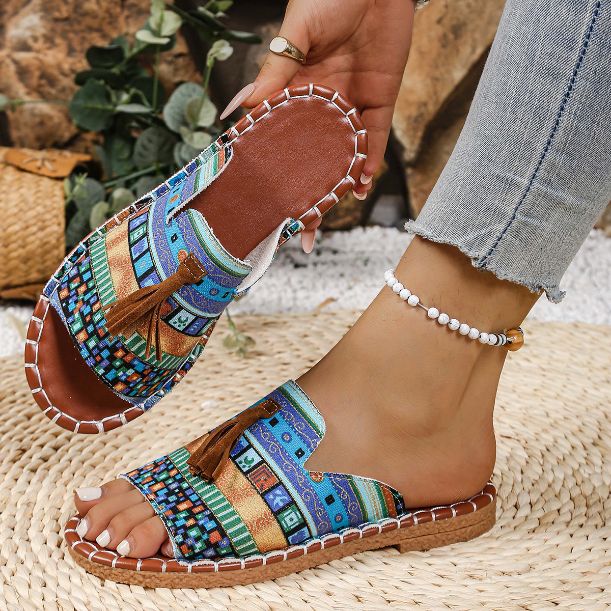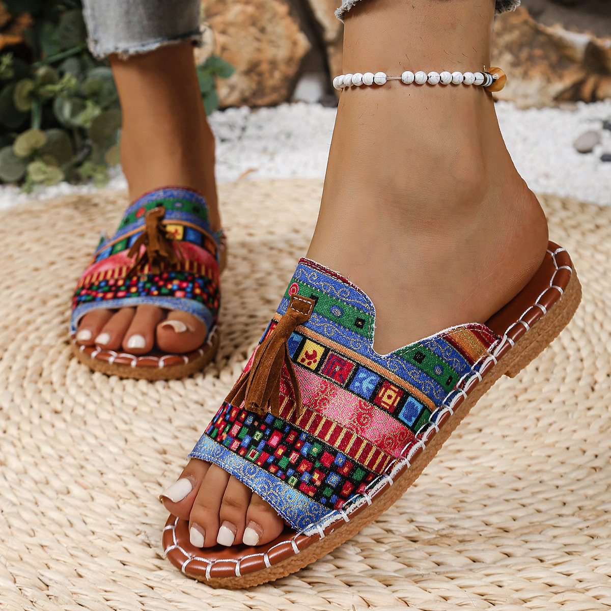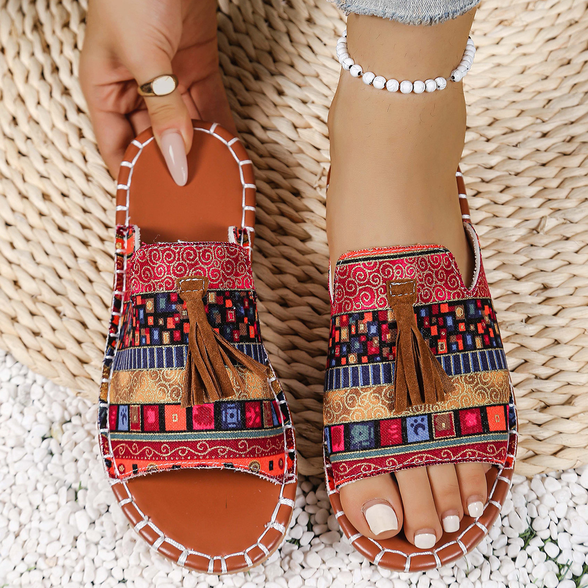 Women's Boho Tassel Sandals – Ethnic Style Summer Flats with Fringe Details
