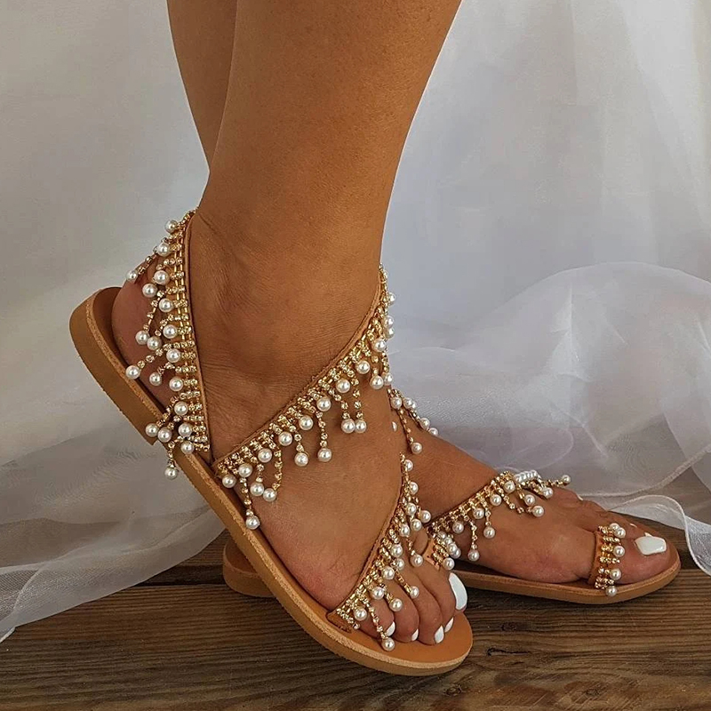 These sandals are decorated with a chain full of rhinestones with gold undertones color and pearls that hang out. All the embellishments are hand sewn onto the leather straps. They feature a toe ring and a long leather strap that embrace and flatter your feet. The soles are rubber with heel height 1.5 cm (0.59 inches) which offers stability and comfort.