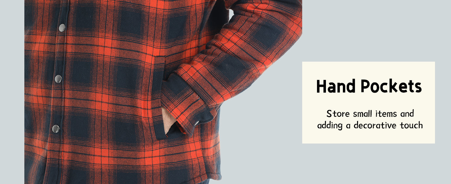 • 5 POCKETS: 2 side pockets, 2 chest pockets and 1 inside pocket, which can keep your cell phone, keys and small essentials wthin reach of this flannel hooded shirt jacket.